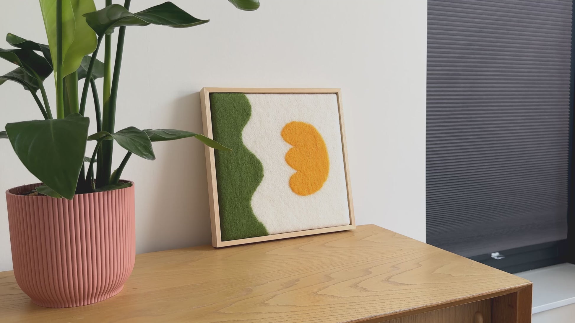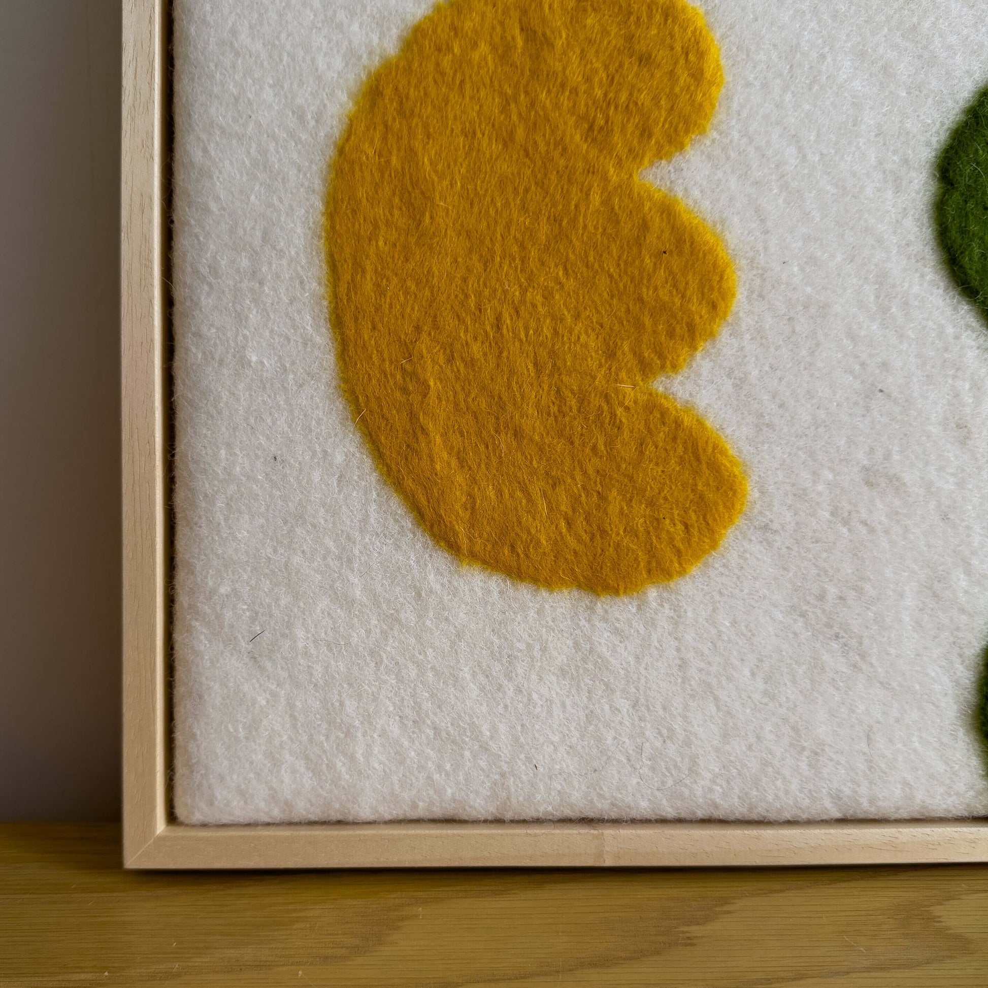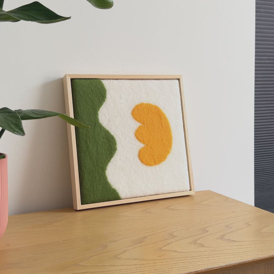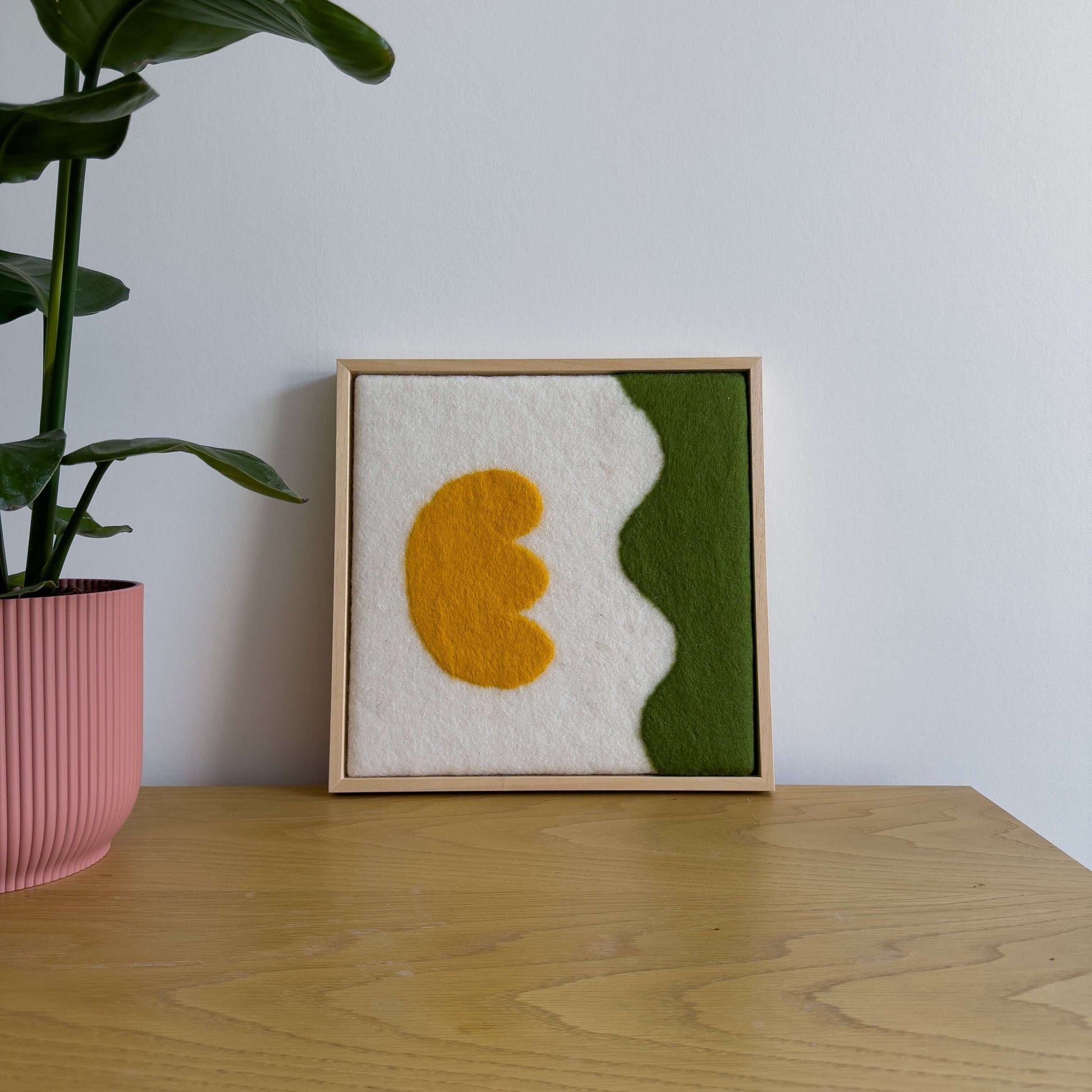 Handgemaakt schilderij van wol uit onze serie Flowers. Vrolijke felle kleuren en geïnspireerd op de prachtige vormen van bloemen. Past in ieder interieur. Onze wanddecoratie wordt standaard geleverd met op maat gemaakte baklijst.