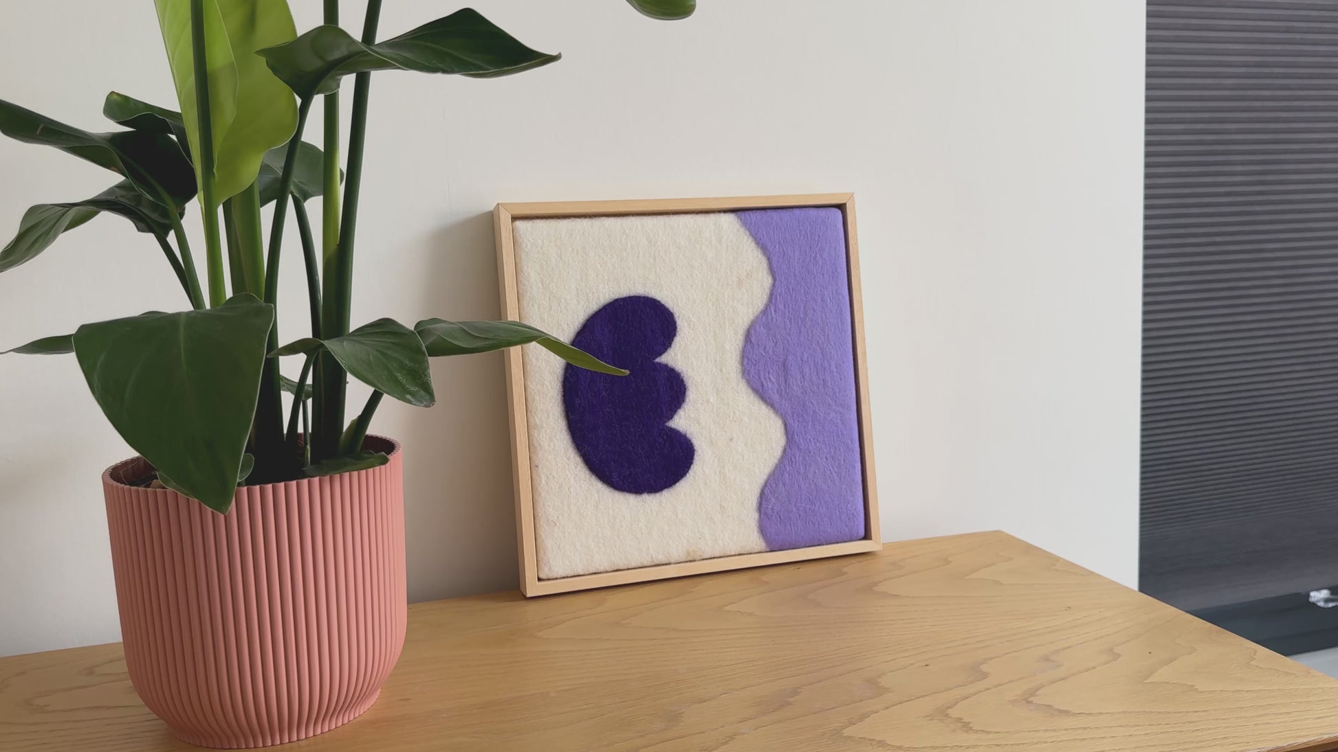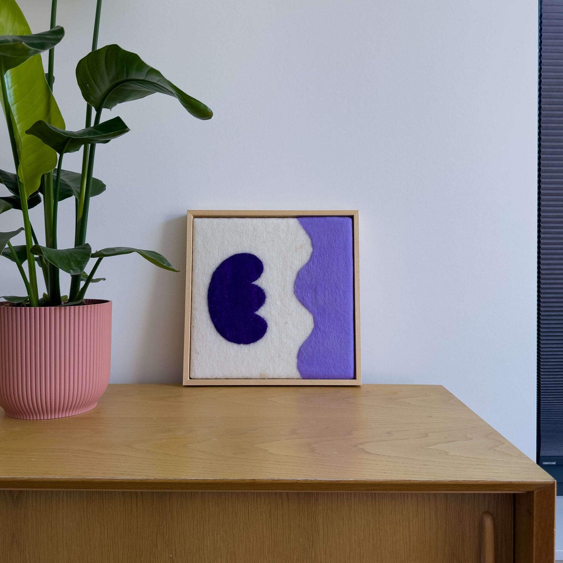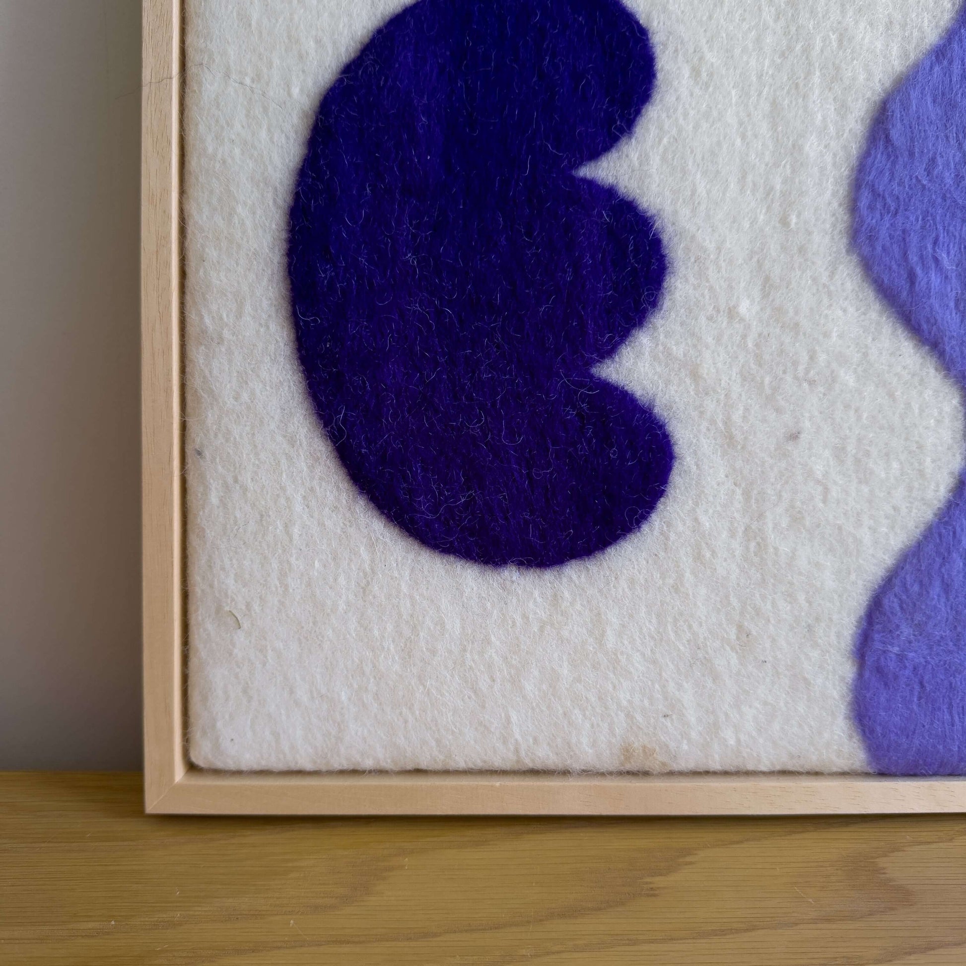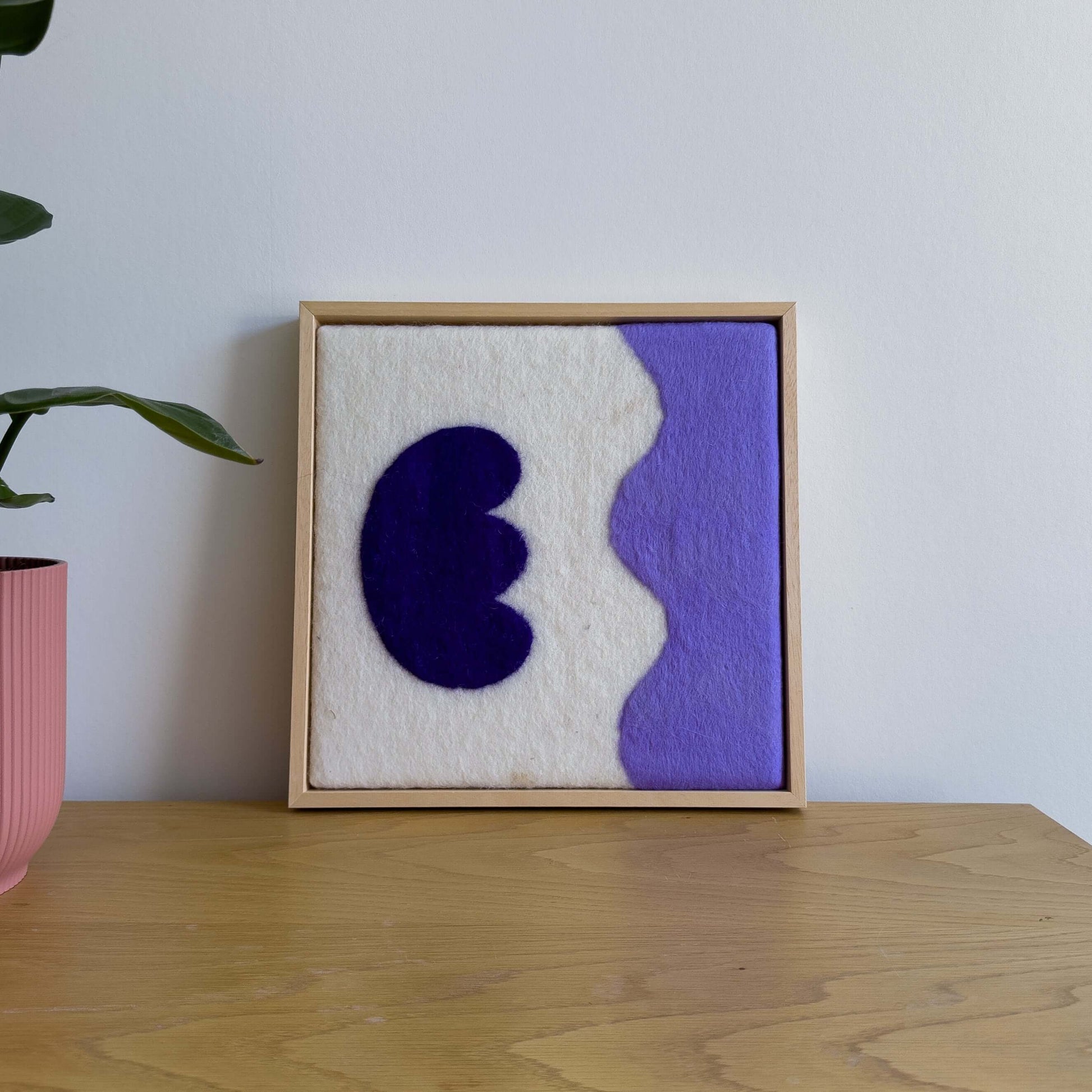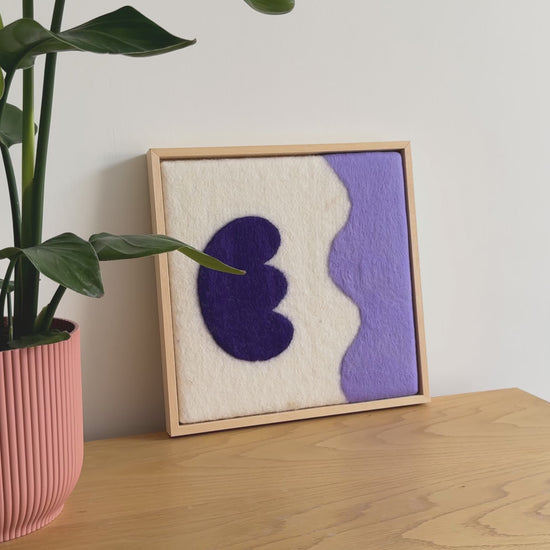 Handgemaakt schilderij van wol uit onze serie Flowers. Vrolijke felle kleuren en geïnspireerd op de prachtige vormen van bloemen. Past in ieder interieur. Onze wanddecoratie wordt standaard geleverd met op maat gemaakte baklijst.