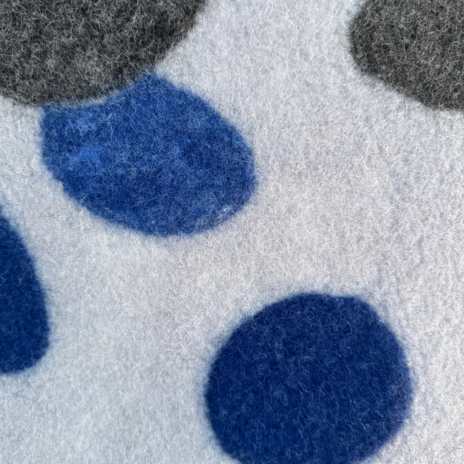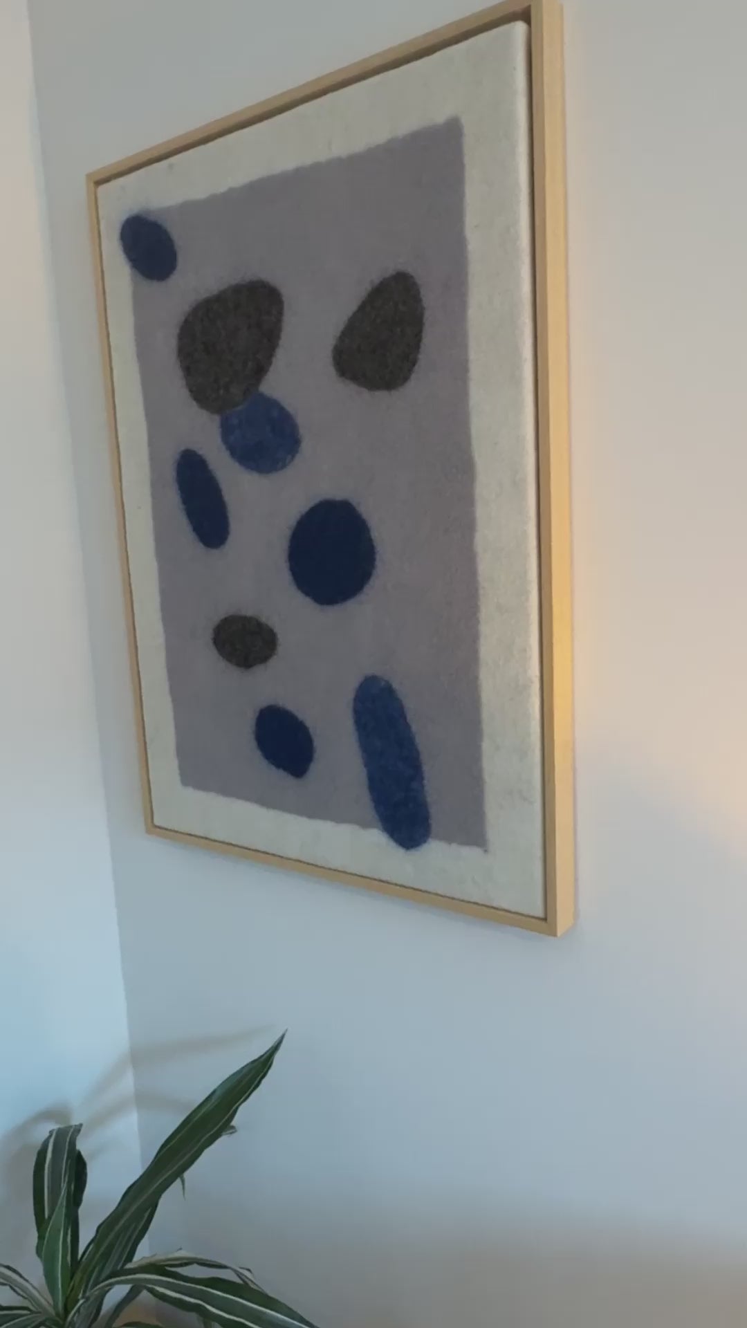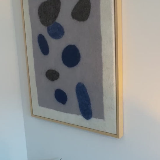 Handgemaakt wandkleed van vilt uit onze serie Stone. De subtiele blauw- en grijstinten zijn neutraal maar hebben door het wolvilt een zachte uitstraling. Onze wanddecoratie wordt standaard geleverd met op maat gemaakte baklijst.